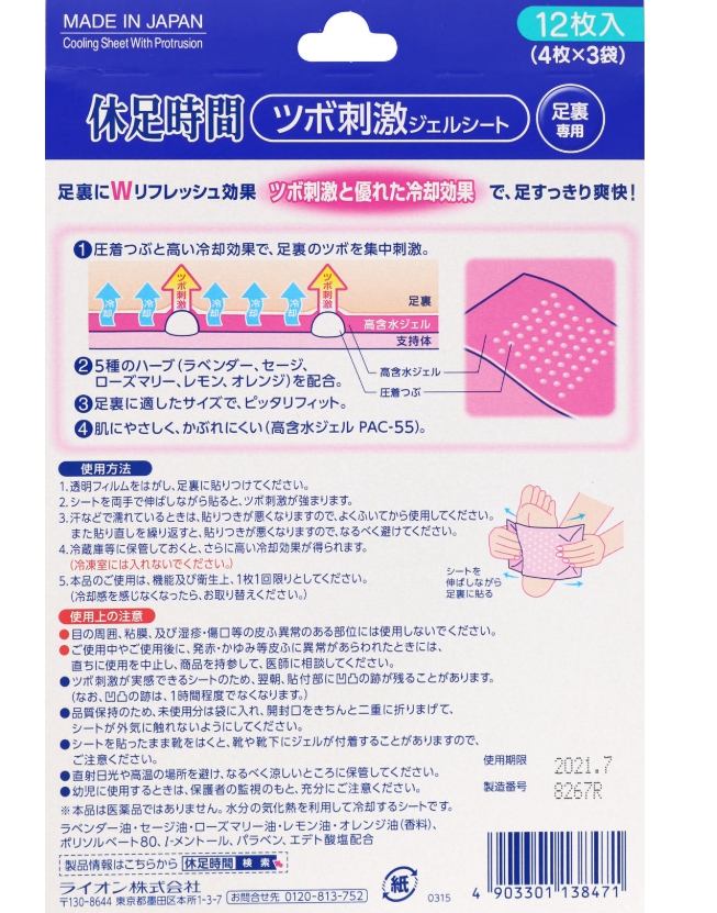 花王 ライオン 仕入 休足時間 卸 ツボ刺激 ジェルシート 足うら 冷却シート 12枚入 (1ケース)